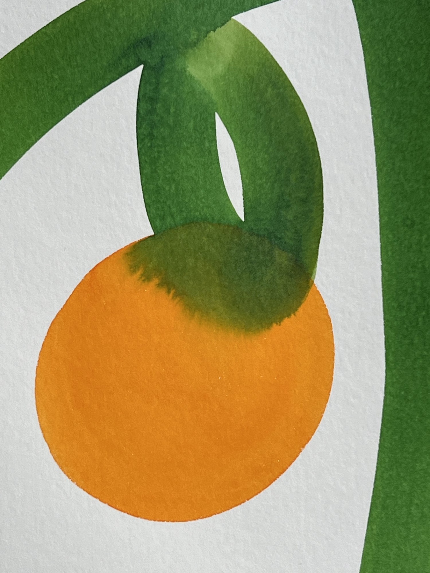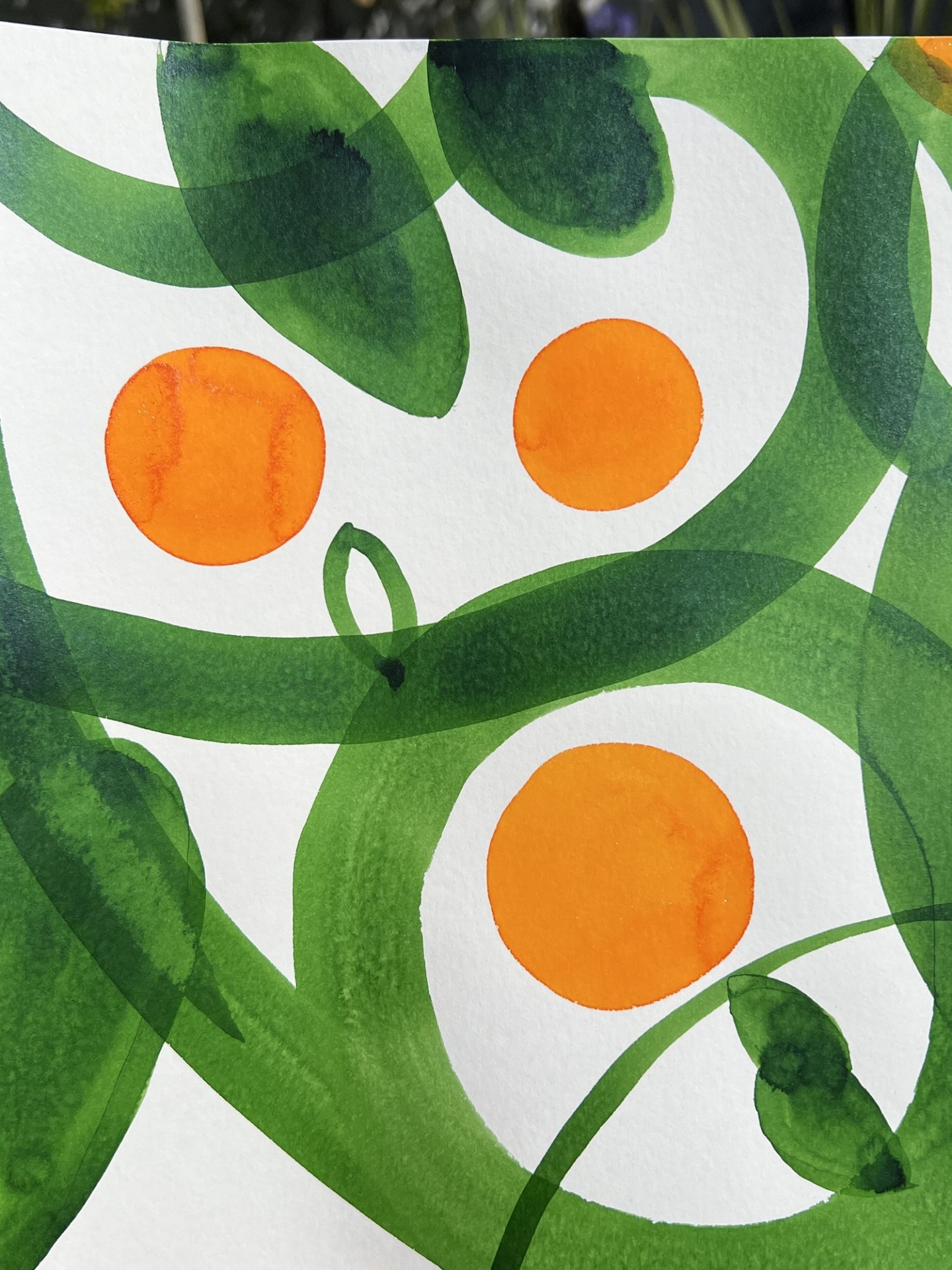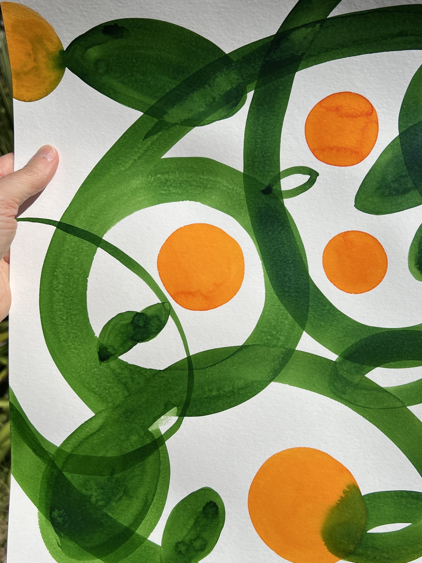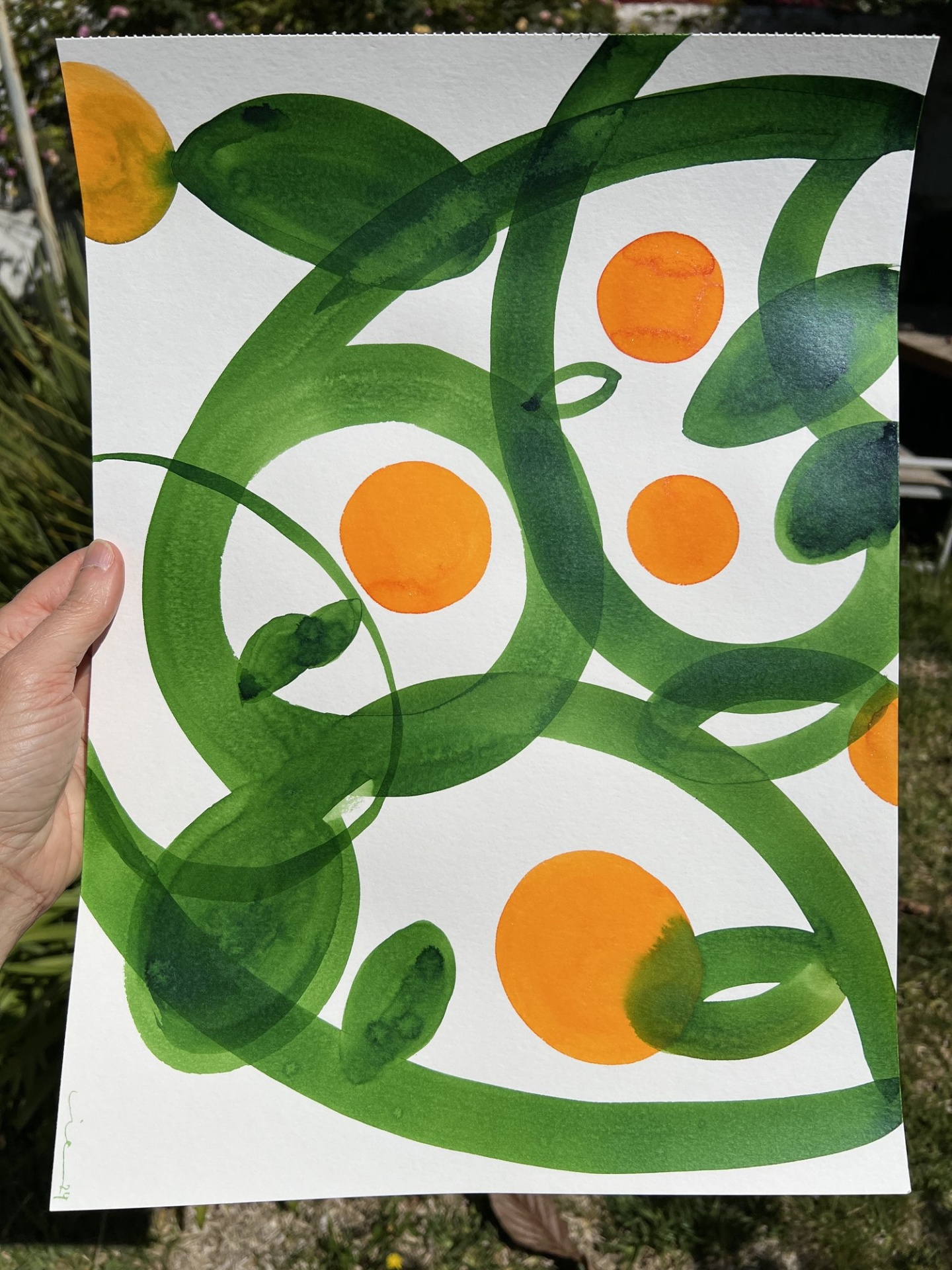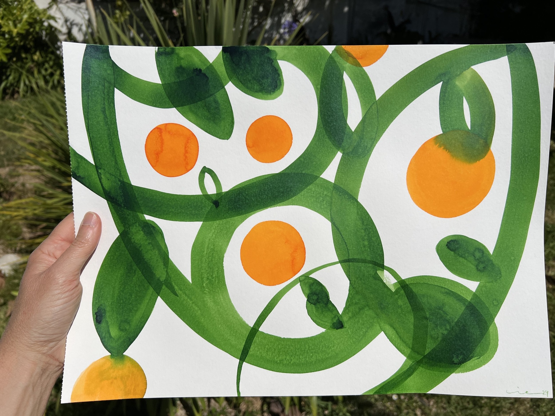 Orangerie IV - Orangery IV/ Laranjal IV, Acrylic and watercolors (écolines) on paper, 41x29.7cm (approx. A3), Original painting. The slight shine that you see is characteristic of the accumulation of écoline (in this case in the orange), it is not glitter or iridescent paints. It depends on the light and the angle. The colors are very beautiful in person.