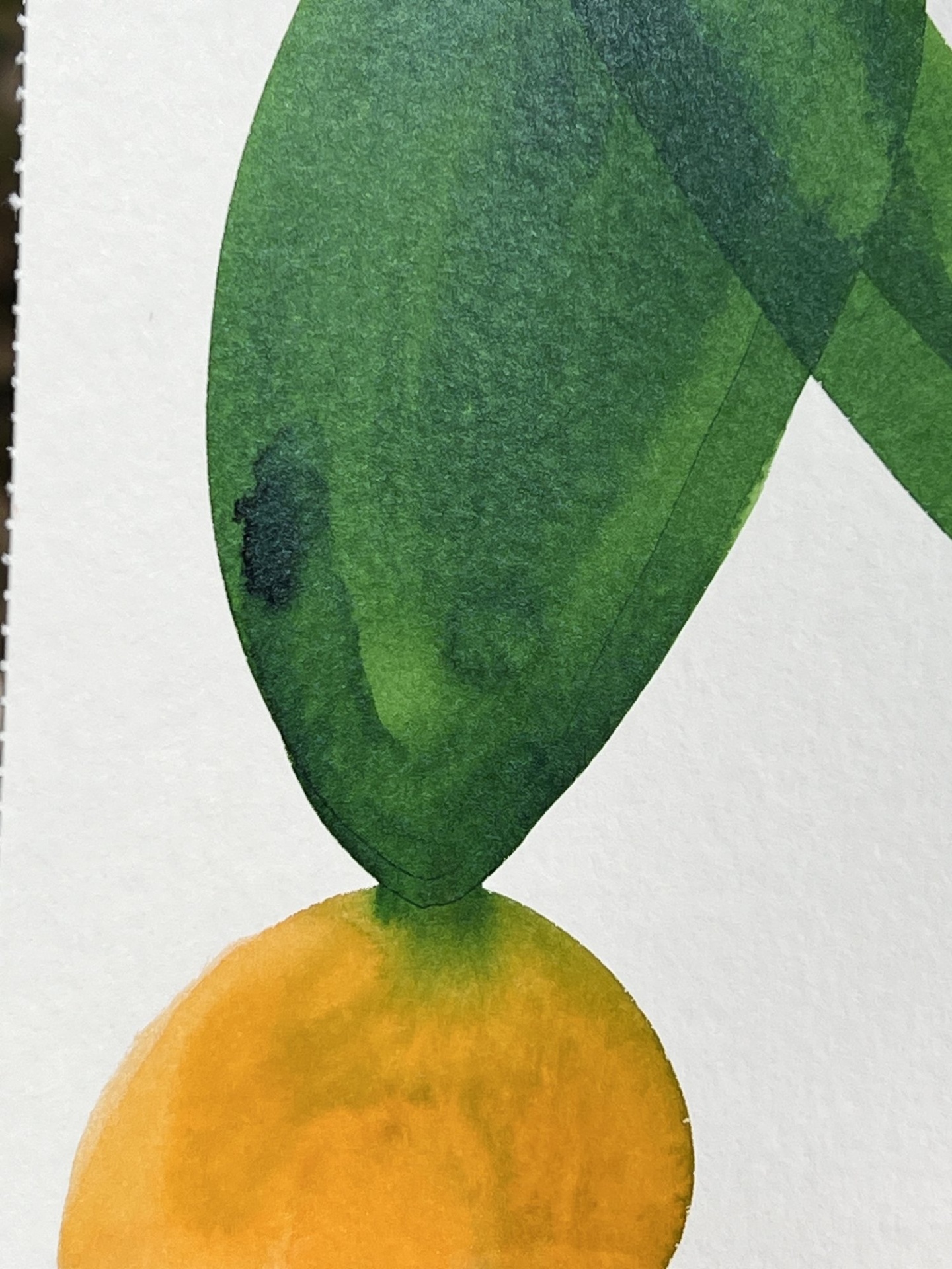 Orangerie IV/ Laranjal IV, Acrílico e écoline sobre papel, 41x29,7 (aprox.A3), pintura original. O ligeiro brilho que se vê é característico da acumulação de écoline (neste caso, no laranja), não são purpurinas nem tintas iridiscentes. Depende da luz e do ângulo. Ao vivo as cores são muito bonitas.