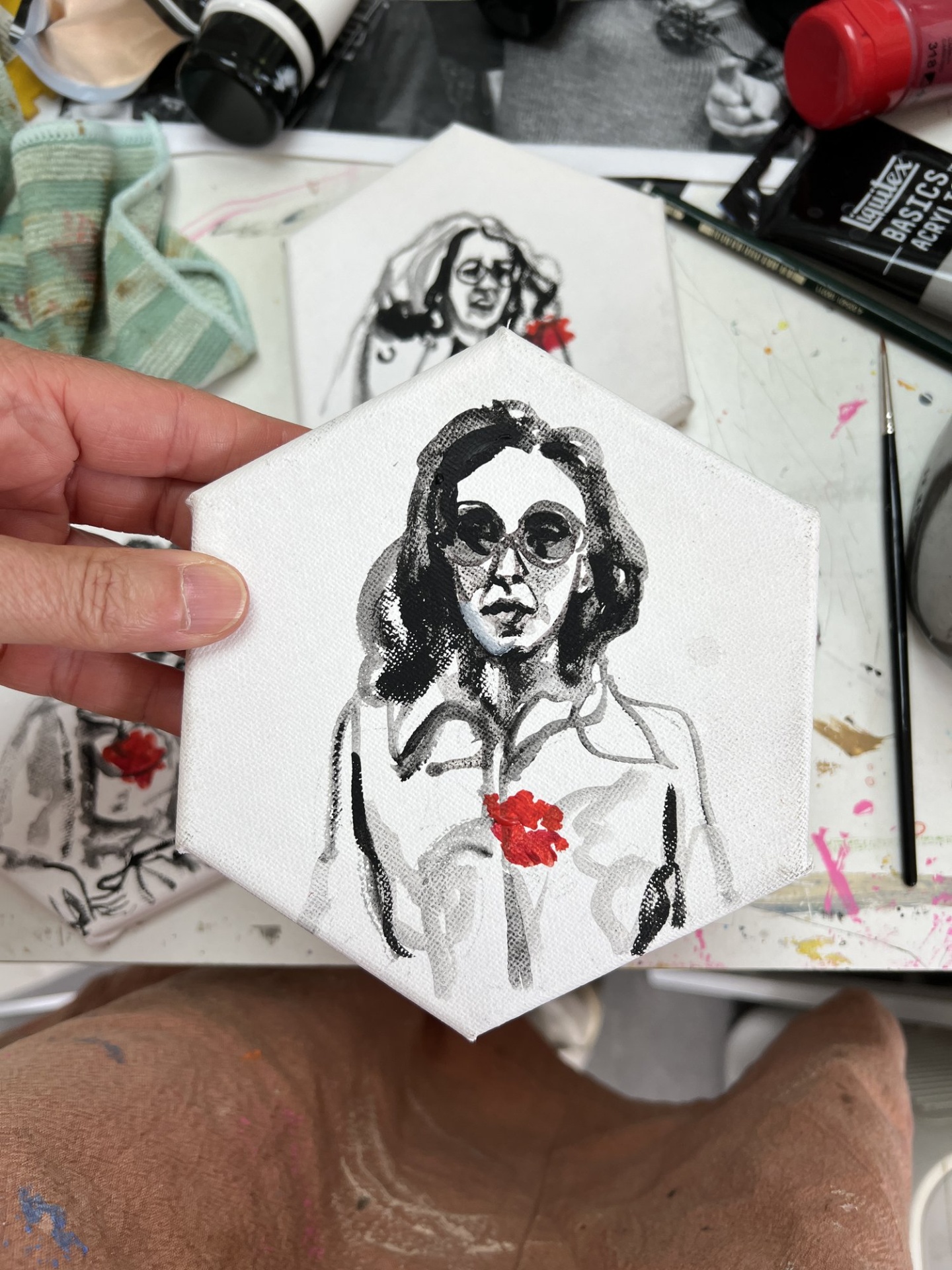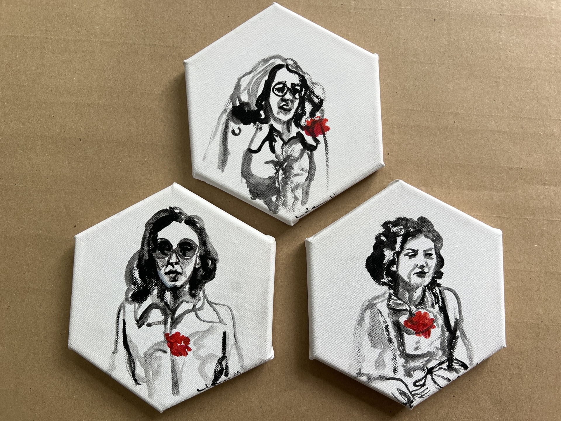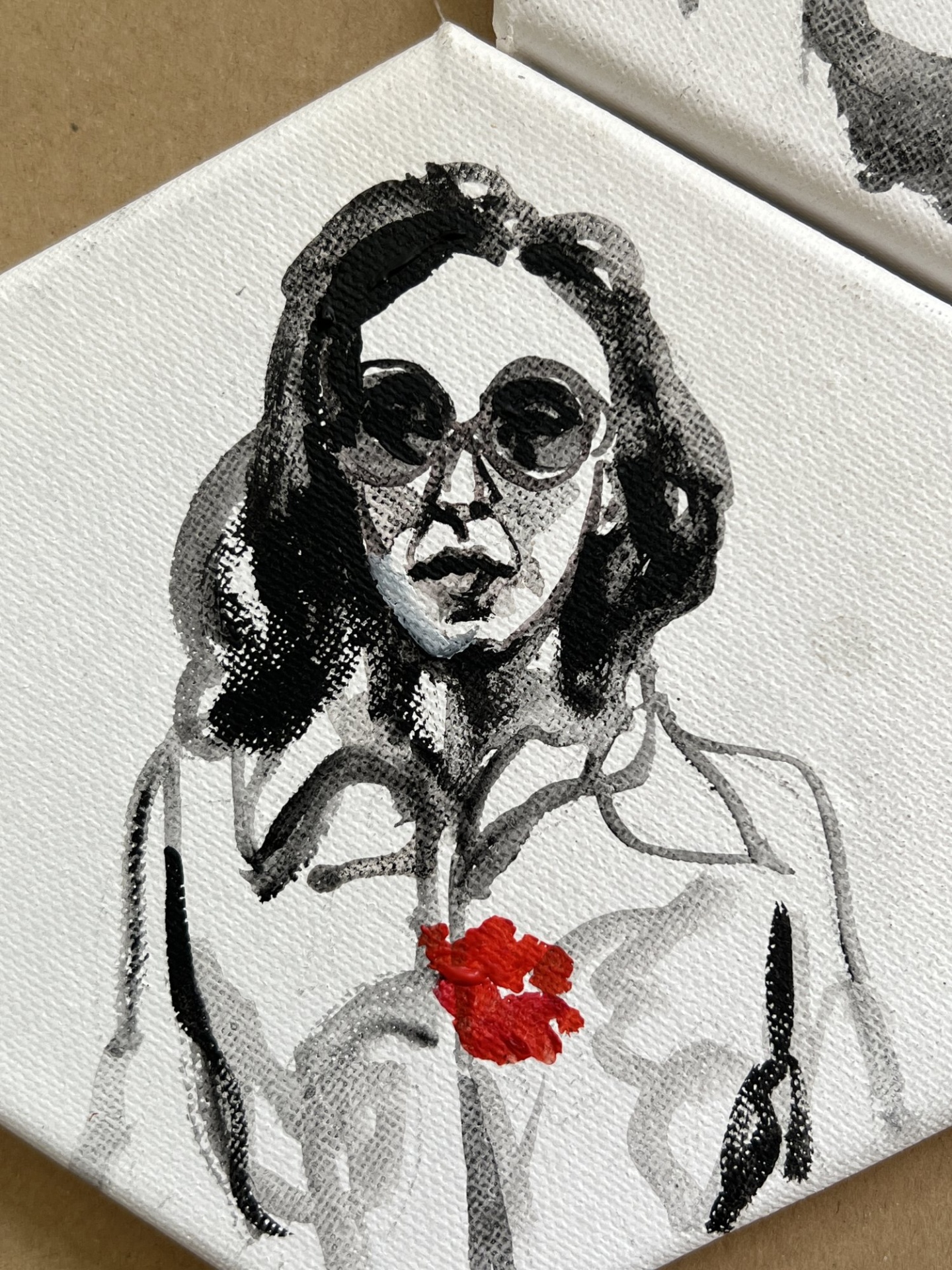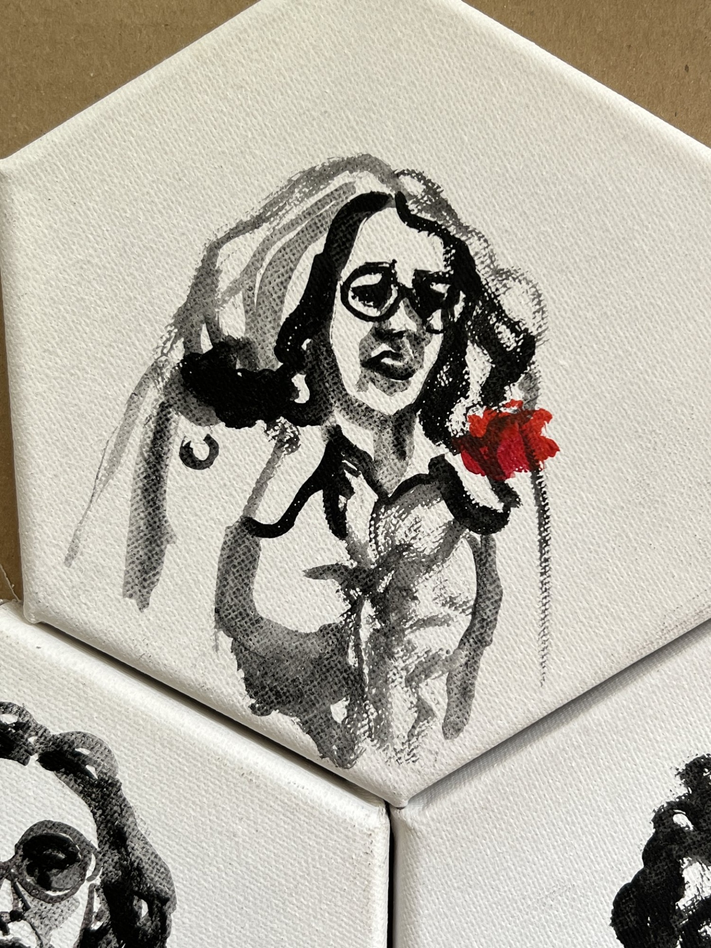 Hexagonal canvases with 7.5 cm on each sides, acrylic paint.
