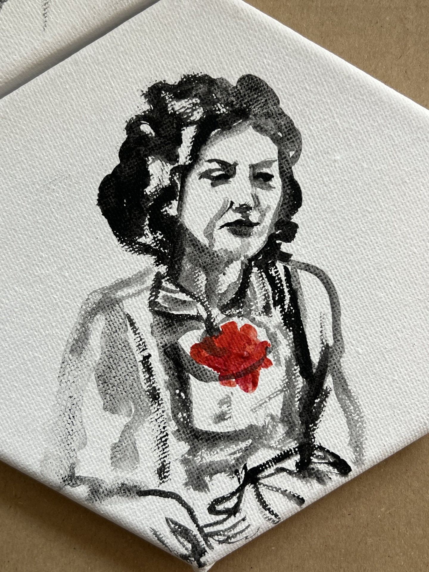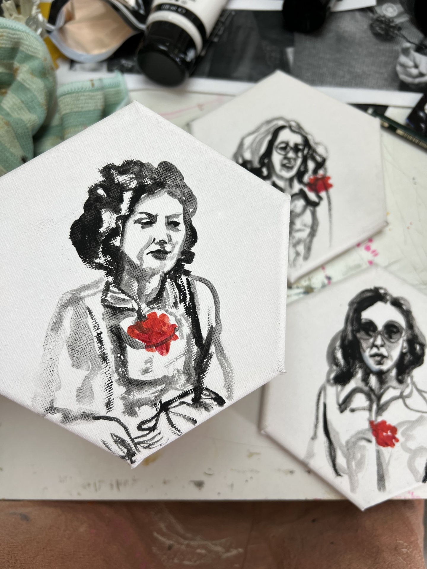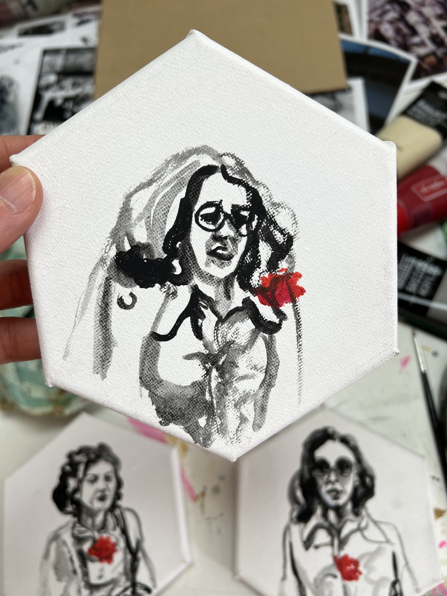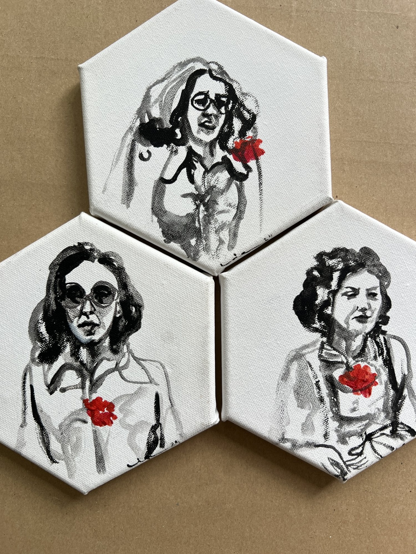 Hexagonal canvases with 7.5 cm on each sides, acrylic paint.