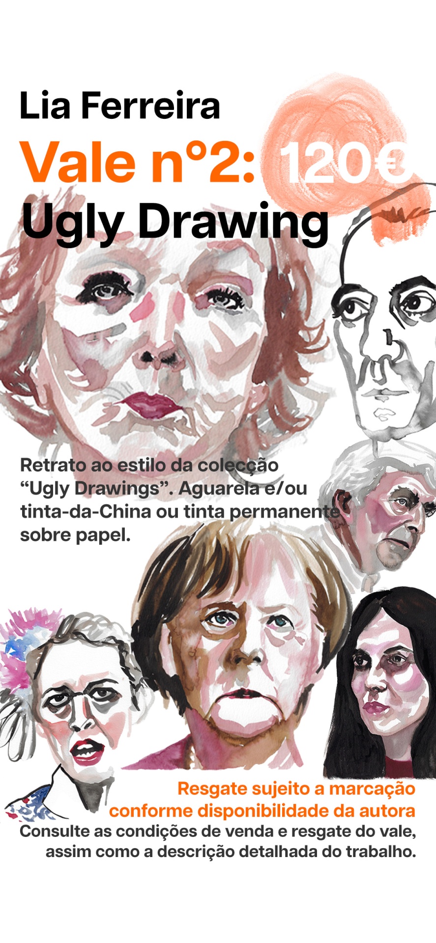 Retrato de 1 pessoa, ao estilo da colecção Ugly Drawings, da autoria de Lia Ferreira (ver exemplos aqui), em aguarela e/ou tinta-da-China ou tinta permanente sobre papel de aguarela. Formato entre o A4 e o 24x32cm.
