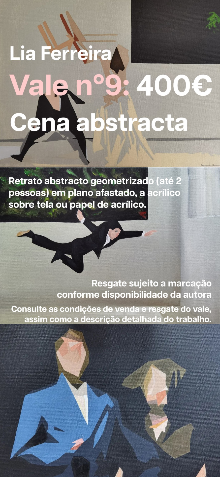 Retrato abstracto, geometrizado, de até 2 pessoas em plano afastado, da autoria de Lia Ferreira, a acrílico sobre tela ou papel para acrílico. Formato até ao A3, aproximadamente (pode variar ligeiramente).